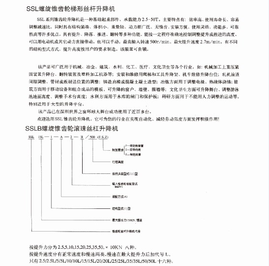 SSL錐齒輪絲桿升降機啥一種基礎起重部件,承載能力2.5-50T.主要特點有:效率高、使用壽命長、容易調整減速比。同時具有結構緊湊、體積小、重量輕、動力源廣泛、無噪音、安裝方便、使用靈活、功能多、可靠性高等許多優點。具有提升、降落、推進、翻轉等多種功能、能按一定程序準確地控制調整提升或推進的高度。可以用電動機或其它動力直接帶動。也可以手動。提高輸入轉速500r/min,最大提升速度2.7m/min。有不同的結構型式方式,提升高度按用戶的需求制造。該裝置可自鎖。