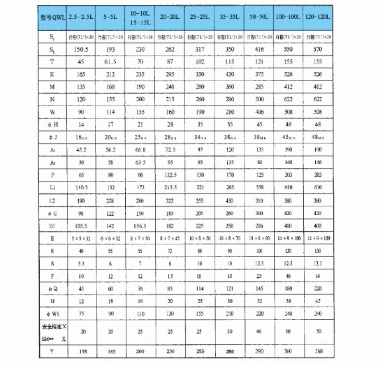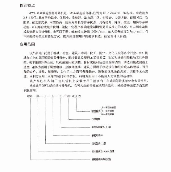 QWL蝸輪絲桿升降機是一種基礎起重部件,已列為JB/ZQ4391-86標準。承載能力2.5~120T。QWL蝸輪絲桿升降機具有結構緊湊、體積小、重量輕、動力源廣泛、無噪音、安裝方便、使用靈活、功能多、配套形式多、可靠性高,使用壽命長等許多優點,具有提升、降落、推進、翻轉等多種功能。QWL蝸輪絲桿升降機能按一定程序準確地控制調整攬或或推進的高度,可以用電動機或其他動力直接帶動。也可以手動,最高輸入轉速1500r/min,最大提升速度2.7m/min。有不同的結構型式和裝配方式,提升高度按用戶的要求制造,該裝置可以自鎖。