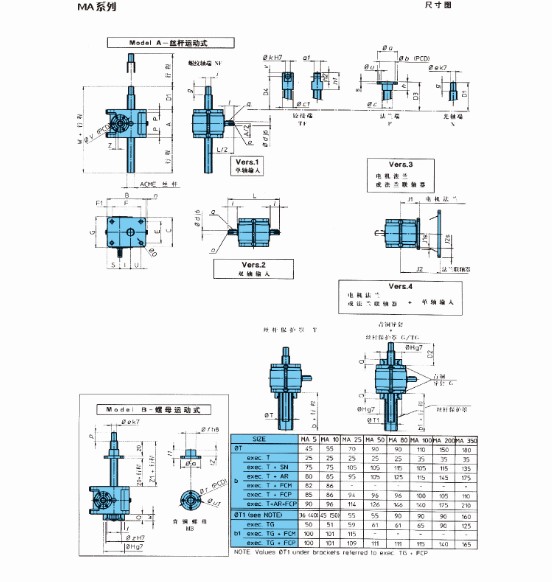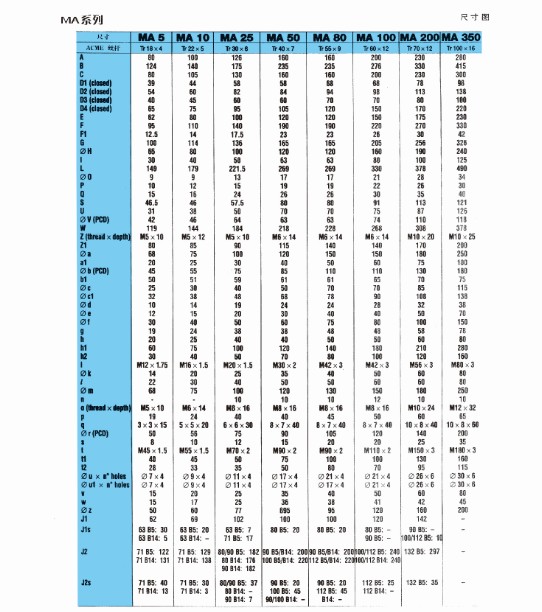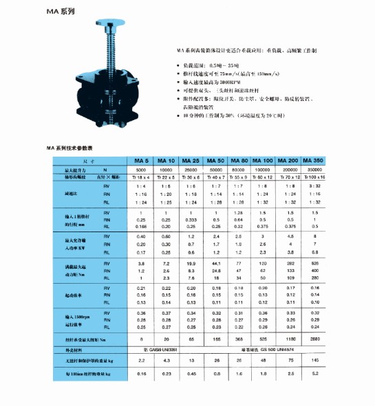 MA螺旋絲桿升降機設計更適合重載應用,重負載,高頻繁工作制,負載范圍0.5噸~35噸,螺旋絲桿升降機升降速度可至75mm/s(最高至150mm /s),輸入速度最高為3000RPM,可提供雙頭,三頭絲杠和滾珠絲杠,10分鐘的工作制為30%(環境溫度為70℃)