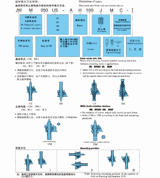 JWM絲桿升降機適用于低速低頻工況,廣泛應用于機械、冶金、建筑、水利設備等行業,具有起升、下降及借助輔件推進、翻轉及各種高度位置調整等諸多功能。JWM蝸輪絲桿升降機是一種基礎起重部件,具有結構緊湊、體積小、重量輕、動力源廣泛、無噪音、安裝方便、使用靈活、功能多、配套形式多、可靠性高、使用壽命長等許多優點??梢詥闻_或組合使用,能按一定程序準確地控制調整提升或推進的高度,可以用電動機或其它動力直接帶動,也可以手動。它有不同的結構形式和裝配形式,且提升高度可按用戶的要求定制。
