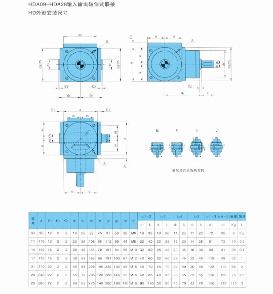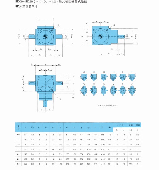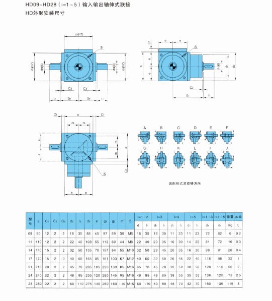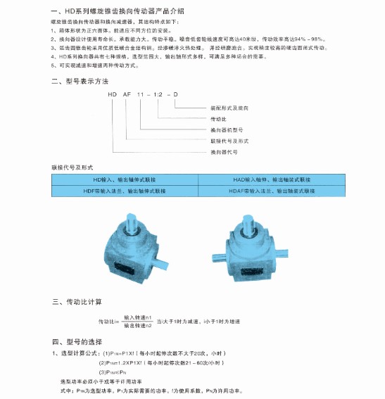 4、HD系列換向器共有七種規格,選型范圍大,輸出軸形式多樣,可滿足多種場合的需要。